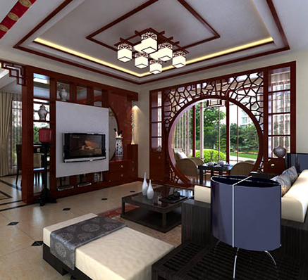 是以中國(guó)傳統(tǒng)文化作為背景,在色彩搭配上以黑、紅、為主,室內(nèi)多采用對(duì)稱式的布局方式,格調(diào)高雅,造型簡(jiǎn)樸優(yōu)美,色彩濃重而成熟。